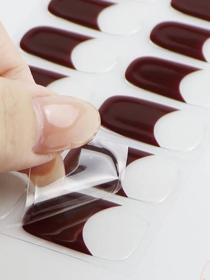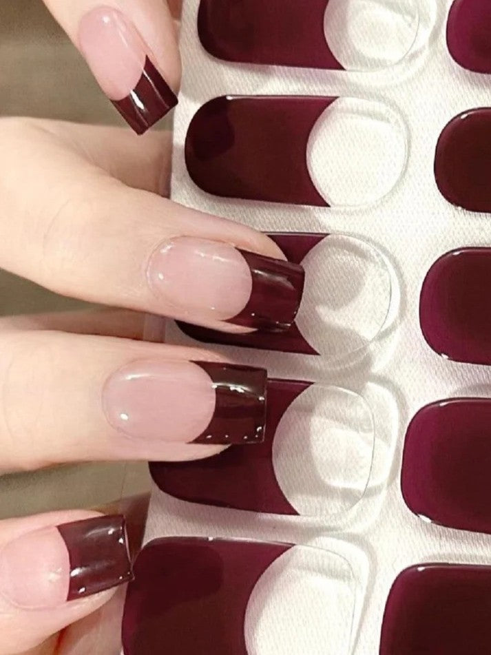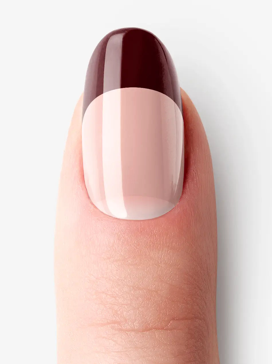 Elegantný a moderný francúzsky štýl s tmavo-bordovým tipom, ktorý pôsobí sofistikovane a štýlovo. Vďaka kontrastu medzi priehľadnou základňou a sýtym koncom nechtu pôsobí dizajn čistým, no zároveň výrazným dojmom.