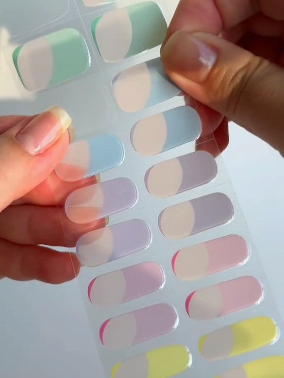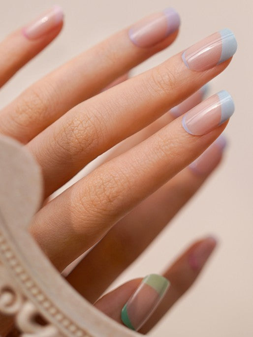 Hravo farebný a svieži dizajn, ktorý pôsobí jemne a zároveň originálne. Pastelové špičky v kombinácii s prirodzenou polopriehľadnou základňou dodávajú nechtom mladistvý a veselý charakter.