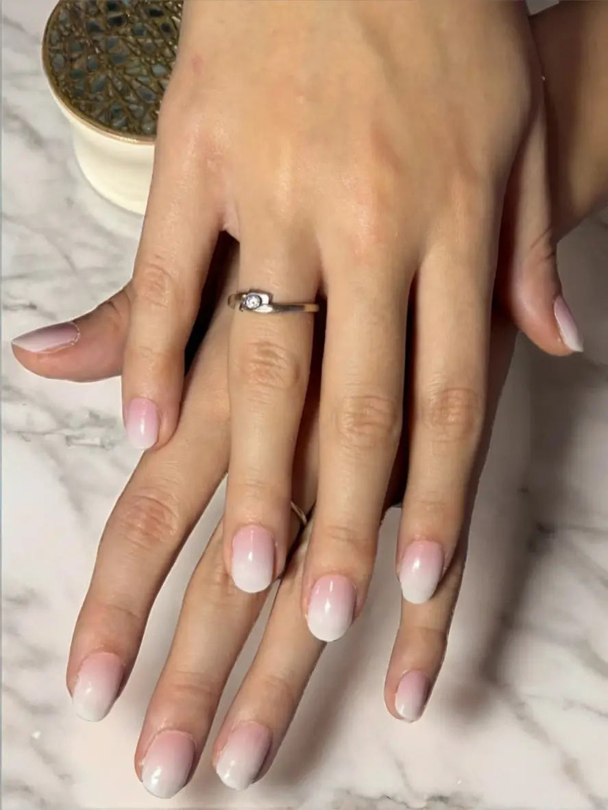 Dizajn bielych ombré nechtov vytvára jemný a elegantný vzhľad, ktorý je vhodný pre sofistikovaný a diskrétny štýl. Mliečnobiely odtieň pripomína jemnosť a hladkosť hodvábu.
