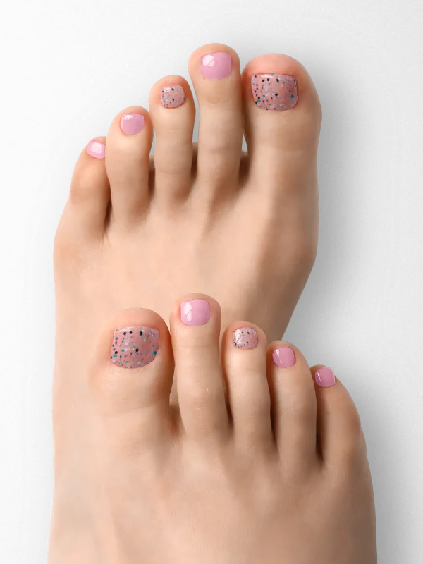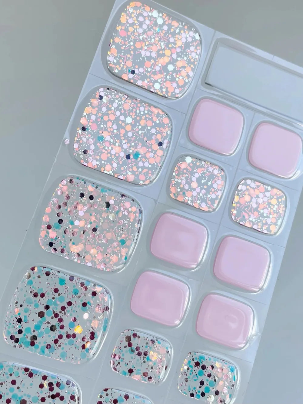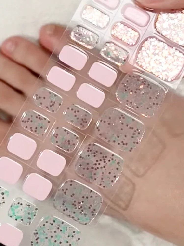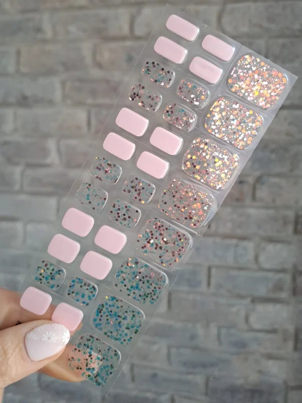 Tento dizajn kombinuje pastelové odtiene ružovej s jemným trblietavým efektom na transparentnom podklade. Je jemný a sofistikovaný, vhodný na dosiahnutie diskrétneho, ale zaujímavého vzhľadu. Kombinácia pastelových farieb s trblietkami dodáva tomuto dizajnu subtílny, no oslnivý efekt.