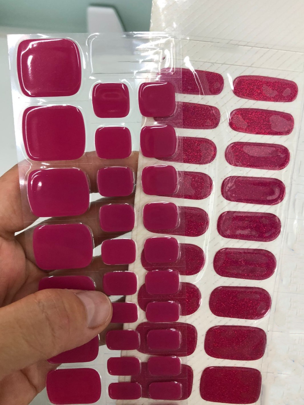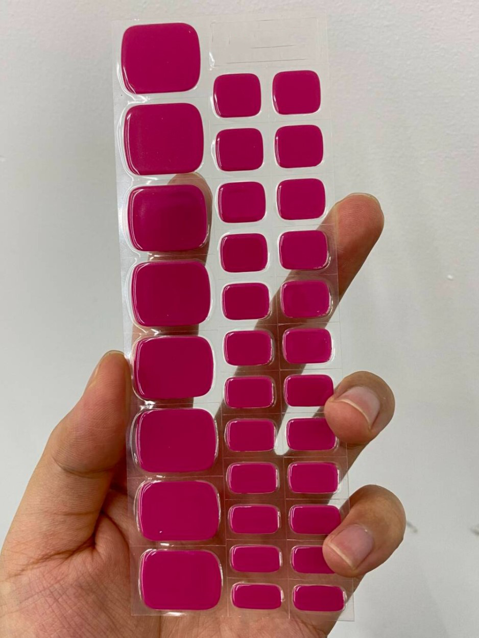 Gélové nálepky na nechty "Ružová fantázia" pre pedikúru ponúkajú nádherný a jednotný dizajn v odtieňoch tmavo ružovej farby. Tento dizajn vyniká svojím čistým, elegantným vzhľadom bez vzorov, čo umožňuje dosiahnuť sofistikovaný a upravený výzor vašich nechtov.