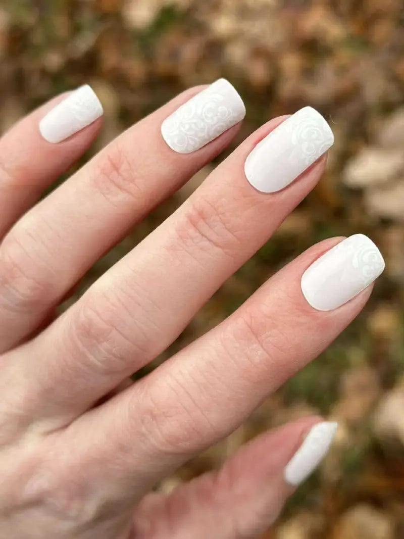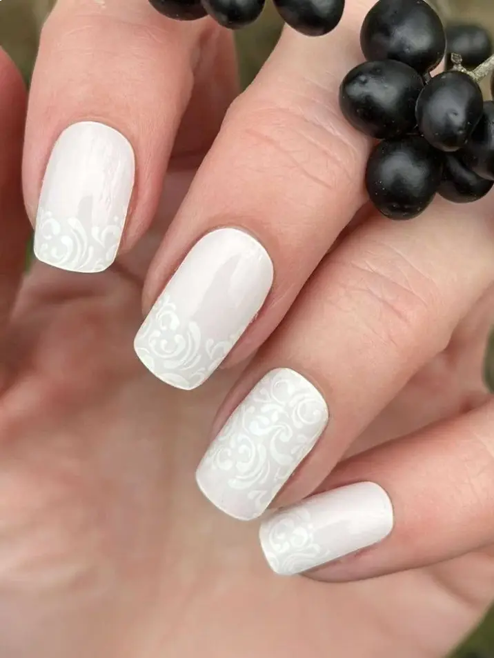 Jemná a sofistikovaná manikúra s elegantnými bielymi ornamentmi na jemnom nude podklade. Tento dizajn pripomína vznešené vintage čipky, ktoré dodávajú nechtom kráľovský a nadčasový vzhľad.