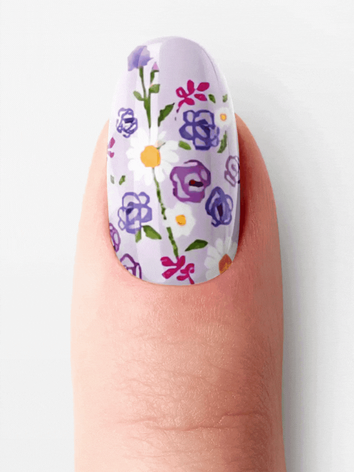Farebnosť a vzory: Rôzne rozmiestnenie kvetinového motívu na jednotlivých nechtoch.