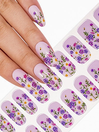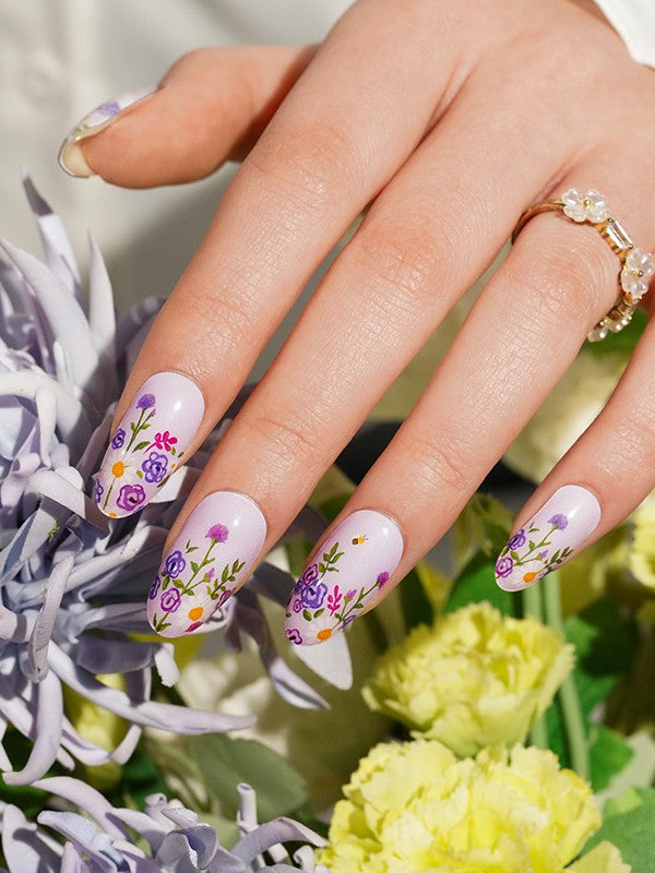 Základ tvorí jemný pastelovo fialový podklad, na ktorom sú rozmiestnené drobné kvetinové motívy v odtieňoch fialovej, ružovej, žltej a zelenej. Dizajn pripomína namaľovanú rozkvitnutú lúku a vytvára veselý, no zároveň elegantný efekt.
