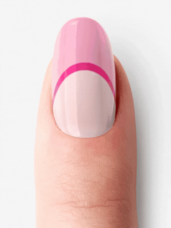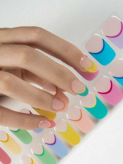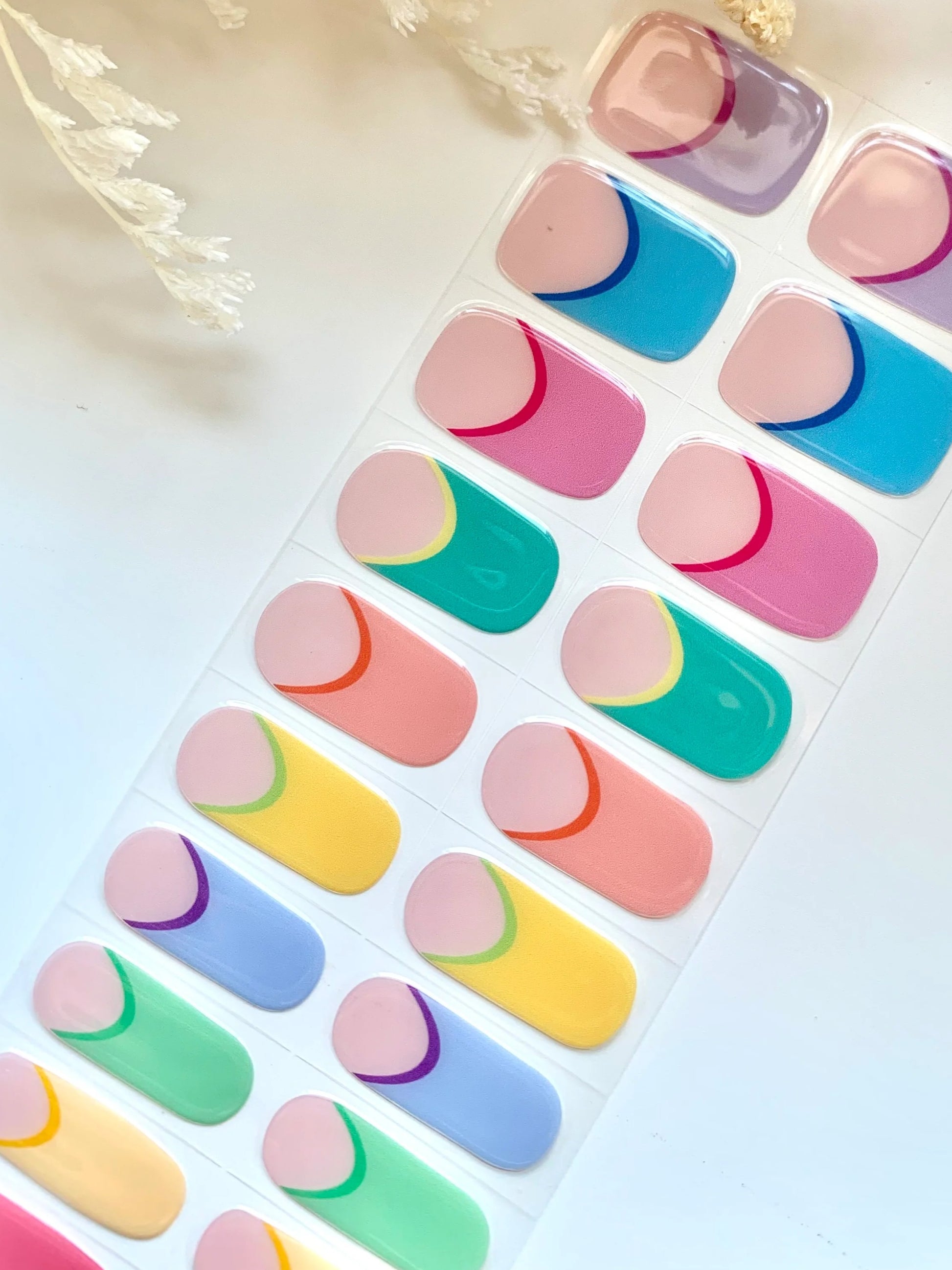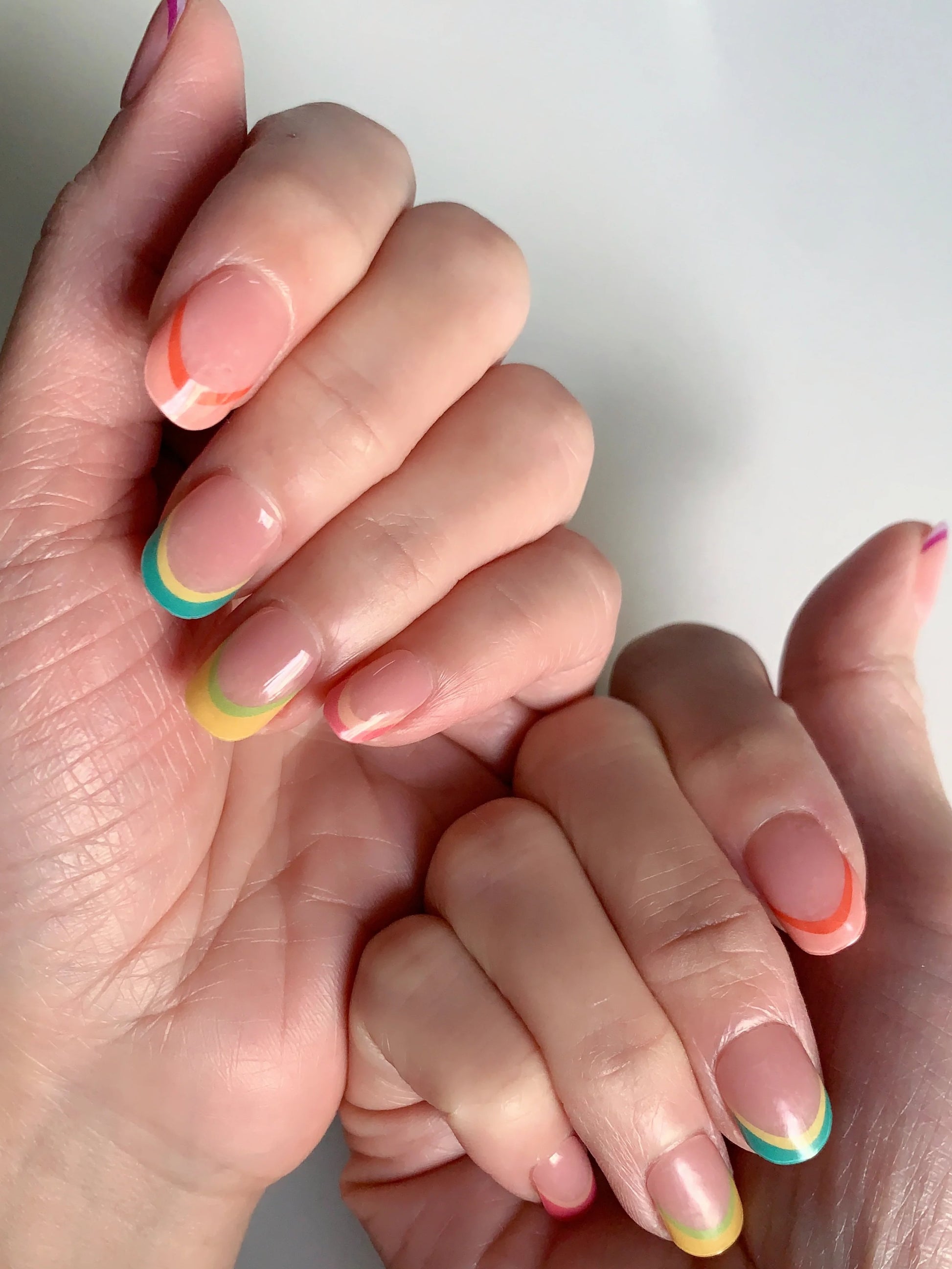 Tento dizajn je maximálne hravý, radostný a plný života. Každý necht má iný farebný oblúk (inverzná „francúzska manikúra“) v pastelových a žiarivých tónoch. Základ zostáva polotransparentný jemne telový, takže farebná špička krásne vynikne.