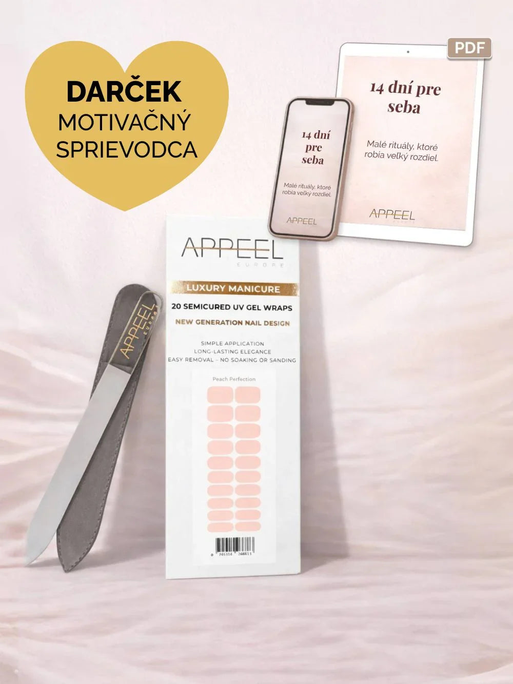 - 1× gélové nálepky Appeel podľa Vášho výberu (Obsahuje: 20 nálepiek, mini pilník, drevenú paličku a čistiaci obrúsok)
