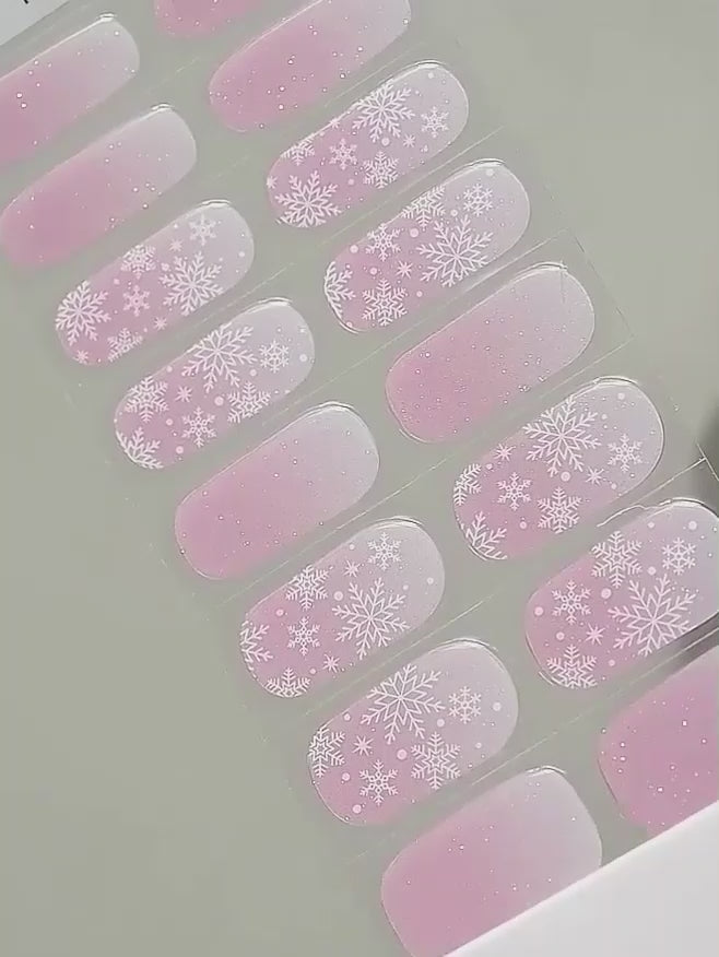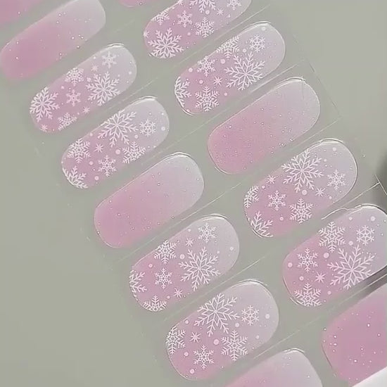 Mäkký ružový základ v jemnom ombré efekte a biele detailné snehové vločky na vybraných nechtoch.