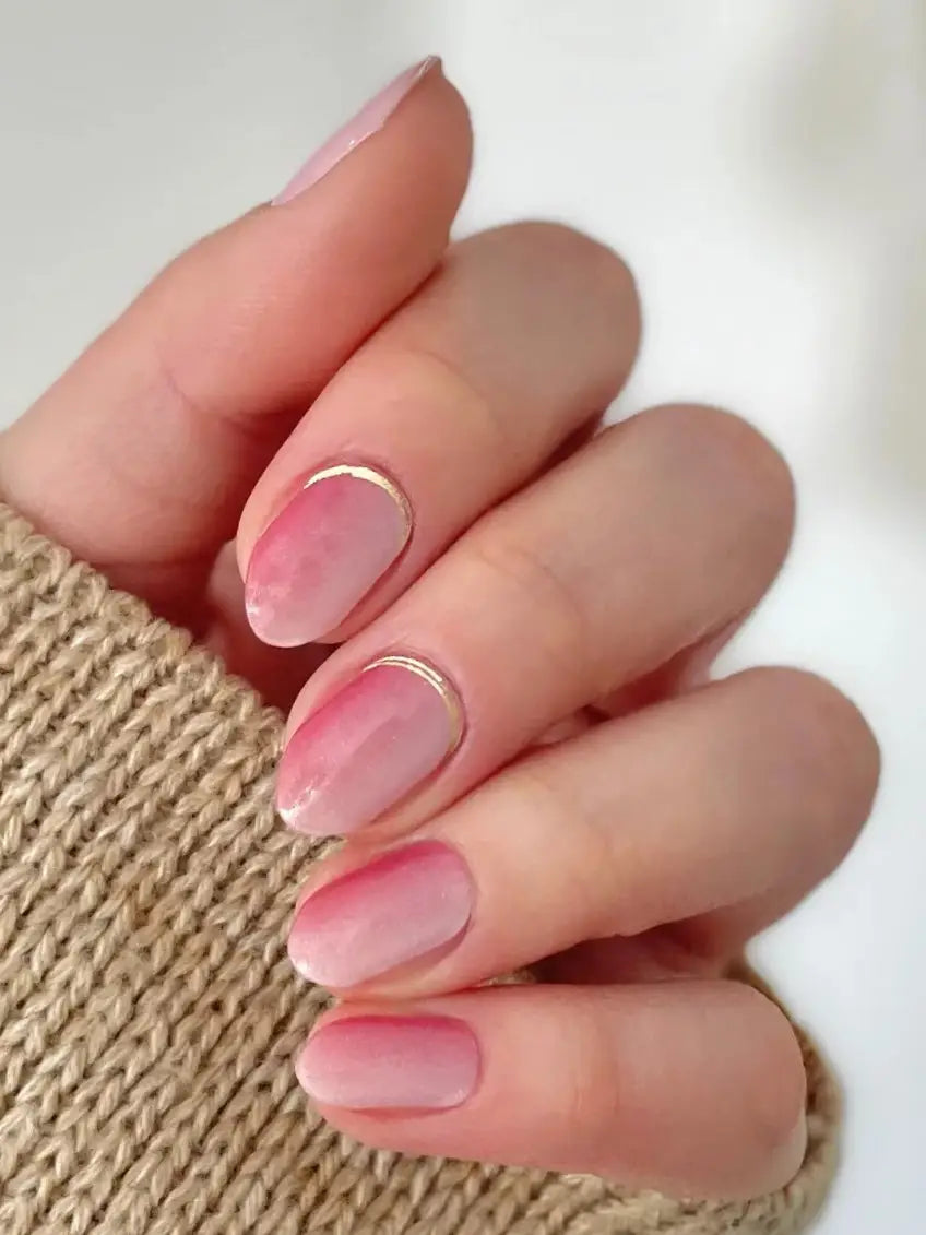 Jednotný vzhľad s elegantným prvkom - všetky nechty majú rovnaké farby v štýle ombré. Vybrané nálepky sú doplnené o zlatý prúžok.